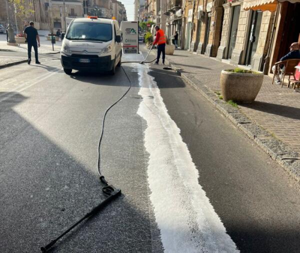 Un tratto del centro storico chiuso per olio idraulico in strada, guasto a spazzatrice