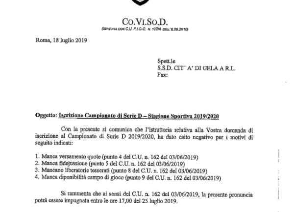 La CovisoD esclude il Gela dalla serie D, ecco cosa serve per evitare la cancellazione