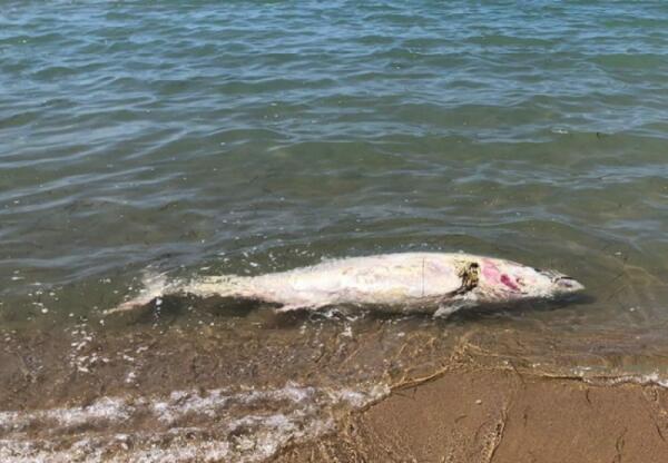 Carcassa di tonno spiaggiato sulla battigia del litorale