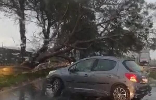 Vento e pioggia sulla città, raffiche sradicano un albero: volato via un serbatoio